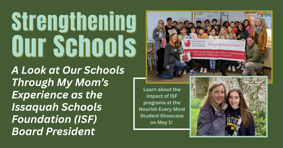 Anna Gaffney In Connections, Volunteer Strengthening Our Schools A Look at Our Schools Through My Mom’s Experience as the Issaquah Schools Foundation Board President The Issaquah Schools Foundation…Read More