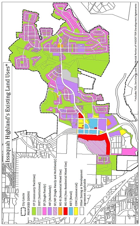 As the Development Agreement term ends (defined by 20 years from the first permitting, rather than the date of signing) the City of Issaquah will determine what zoning will guide future development and land uses. On currently have single family housing, multi-family housing, retail, and commercial entitlements.