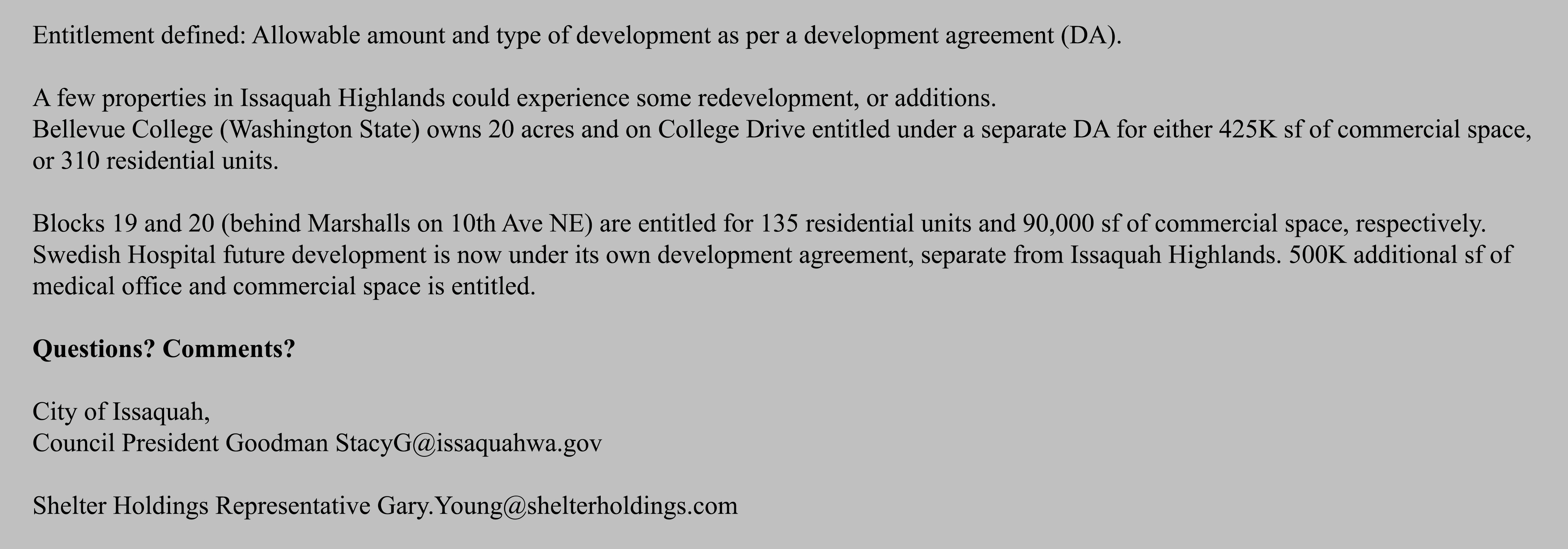 “Entitled” is wording that comes with the Development Agreement that charted the Issaquah Highlands, 20 years ago, signed on June 18, 1996. Different than traditional zoning, a Development Agreement defines “entitlements” for future development, and a term. Issaquah Highlands was planned to be built out over a 20-year term.
