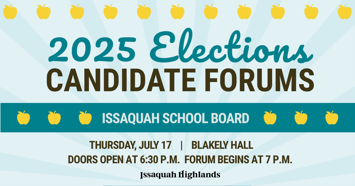 Meet and hear directly from the candidates running for Issaquah School Board and learn about their positions on issues affecting our district. Doors open to mingle with the candidates at 6:30 p.m. Moderated forum begins at 7 p.m.