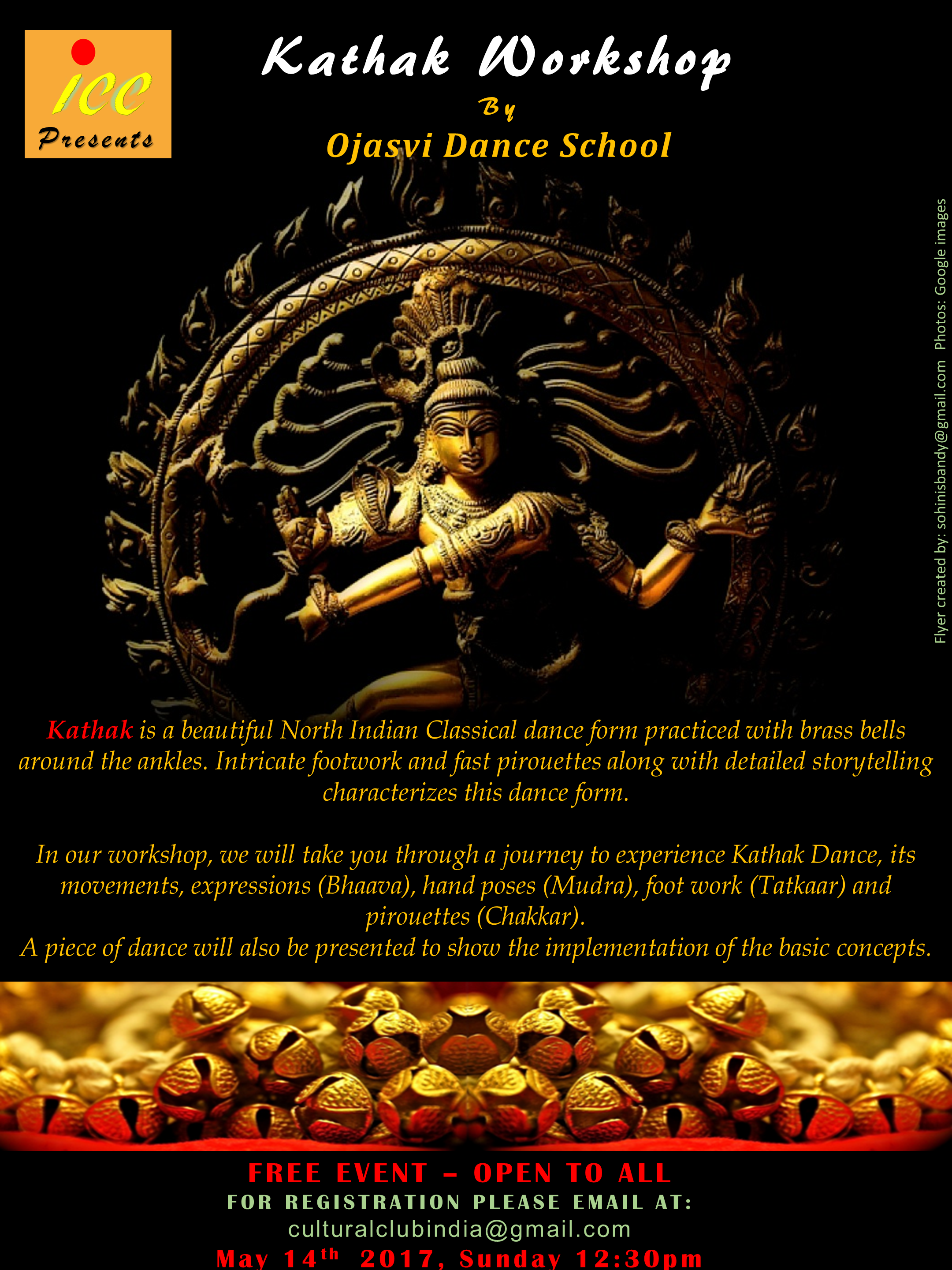 May 14 Special Event: India Cultural Club in association with Ojaswi Dance school is conducting a Kathak workshop on Sunday, May 14th at 12:30 pm. Kathak is an Indian classical dance form whose origin can be attributed to the travelling bards of Northern India, known as ‘Kathakars’ or storytellers. Join us to learn more about this northern Indian dance form at Blakely Hall. For details contact us at culturalclubindia@gmail.com