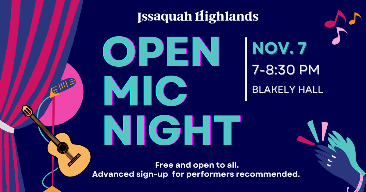 Join us for an evening of fun and entertainment from local talents. Come to sing a song, play music, read poetry, tell a story, perform stand-up comedy, or just join the audience. Make sure to invite family and friends to support our local talent here in Issaquah Highlands. All ages are welcome to participate!