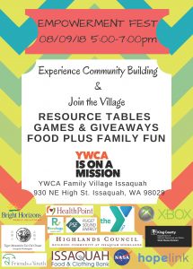 The YWCA Family Village Issaquah is offering their 2nd Annual Empowerment Fest community building for families including resource tables for finances, education, social services along with activities, food and fun!