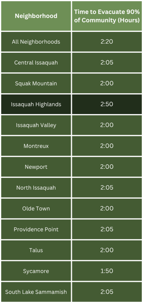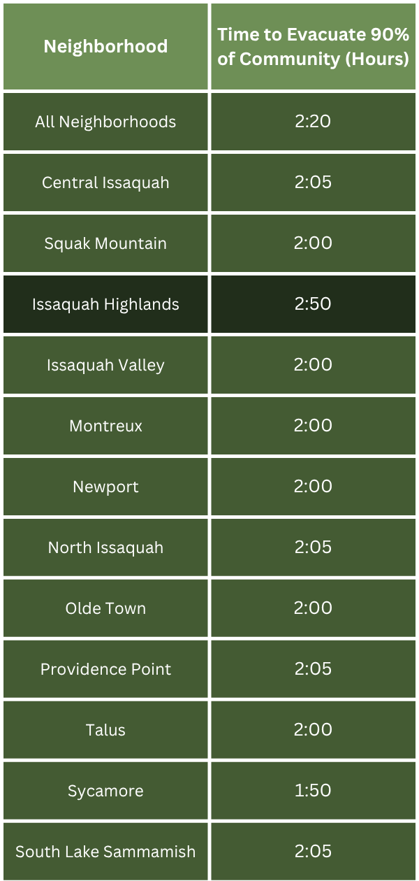 Wildfires may necessitate evacuations to protect you and your family. This year, Issaquah completed a wildfire evacuation study estimating how long it would take 90% of residents to evacuate each neighborhood. The table below shows midday summer estimates.