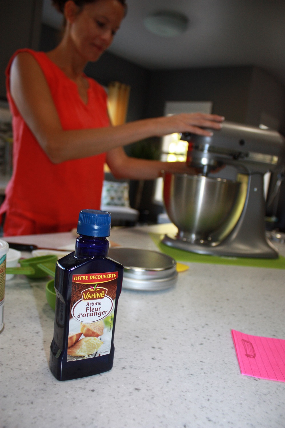 Aline adds the remaining ingredients, including her secret ingredient, the orange blossom extract her mother brings when she visits. It smells flowery and light. The batter is finished mixing and she puts it in the fridge to chill while the oven heats up. This will help create the perfect little bump on top of the cookie.