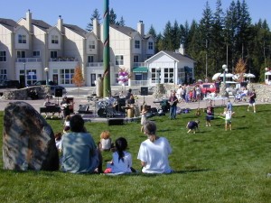 With these principles in mind, Milenko developed the design of the first park to be built in Issaquah Highlands, Ashland Park. Ashland Park encompasses elements creating a gathering place for the new community. At the time of its construction, it was in a central location for the area. The center point of the park, marked by the 65’ cedar pole, is exactly where the four surrounding roads converged. At the base of the pole is a stage that faces a naturally sloped, grassy amphitheater. At the top of the amphitheater is a stairway that leads to a woonerf, or “living street”, designed for pedestrian traffic to be funneled into the park. The stage is backed by a large beautiful boulder, salvaged from nearby construction and turned into a charismatic fountain. Water runs down the rock and through a stream bed and forms a pond behind the stage. A cement semicircle backs the stage and fountain area. Surrounding the park are magnificent natural seating walls made of river rocks, many recovered from the park site itself. Ambient light, illuminating from carved light posts made from cedar trees reclaimed from the site, lights the parameter of the park at night. Also featured is a playground with wooden benches made from repurposed trees.