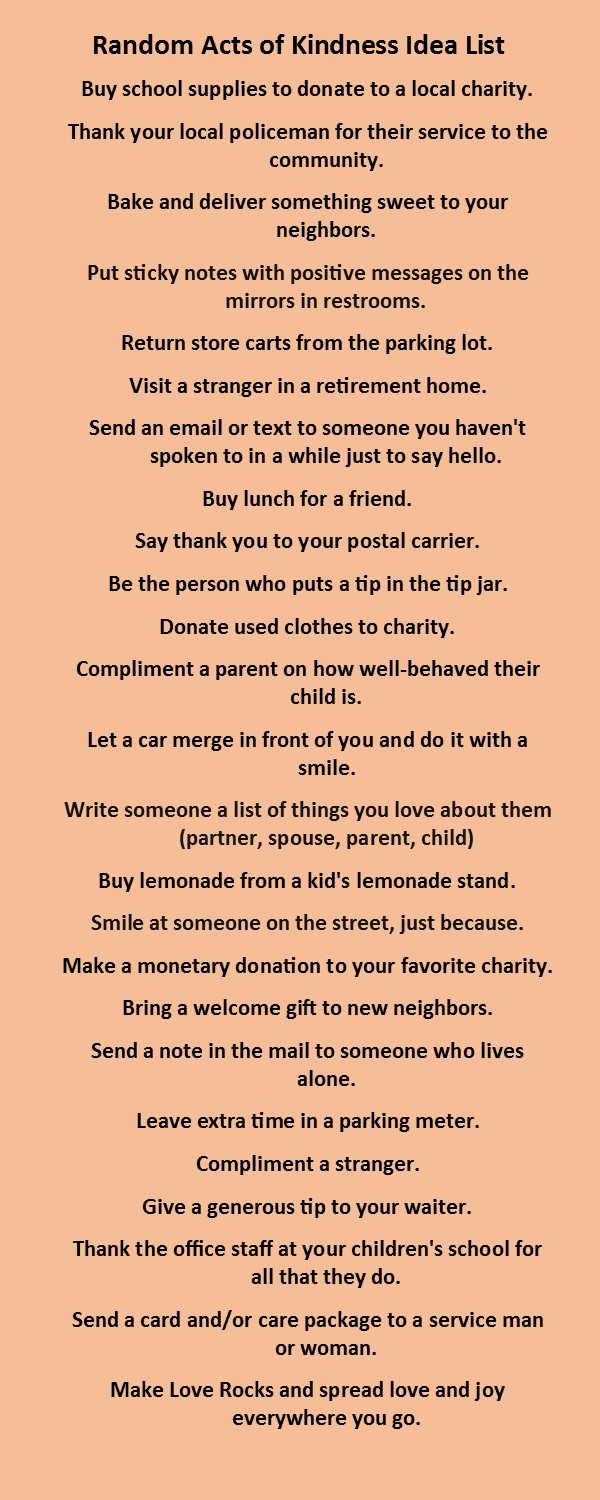 ow did this start exactly? I was turning 40 in a few weeks, and I kept thinking about what I wanted to remember from this milestone birthday, what I wanted it to mean to me, and how I wanted to celebrate it. I am blessed to have an amazing family, great friends, a job that I love, and to be in pretty good health. In recent years, I had a friend who succumbed to cancer at the age of 31, and so in looking at turning 40 all I could feel was how blessed I am. Her passing weighed on how I would view this birthday: less of a burden and more of a celebration of life. I decided that I would do 40 random acts of kindness for my birthday to give back to those around me, and I determined that that while some would be “random” and “spur-of-the-moment”, many of them would be planned—focused on those around me—from my daughter’s teacher, to the mail carrier, to the neighbors who we interact with each day. Other acts I would put out into the w